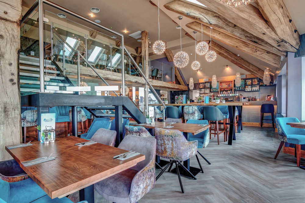 Split over two levels, the interior is contemporary and stylish with a stunning colour scheme of lagoon blue, rich mellow brown, hints of pastel grey and glamorous lighting which combine to bring the relaxing vibe of the Caribbean. Various seating options allow for intimate corners or larger groups and the feature bar has a great drinks menu including a fantastic selection of cocktails. In May 2023 an extension was added allowing further dining space. The attractive outside spacious patio area is the perfect spot to dine al fresco, simply relax and soak up the amazing view.