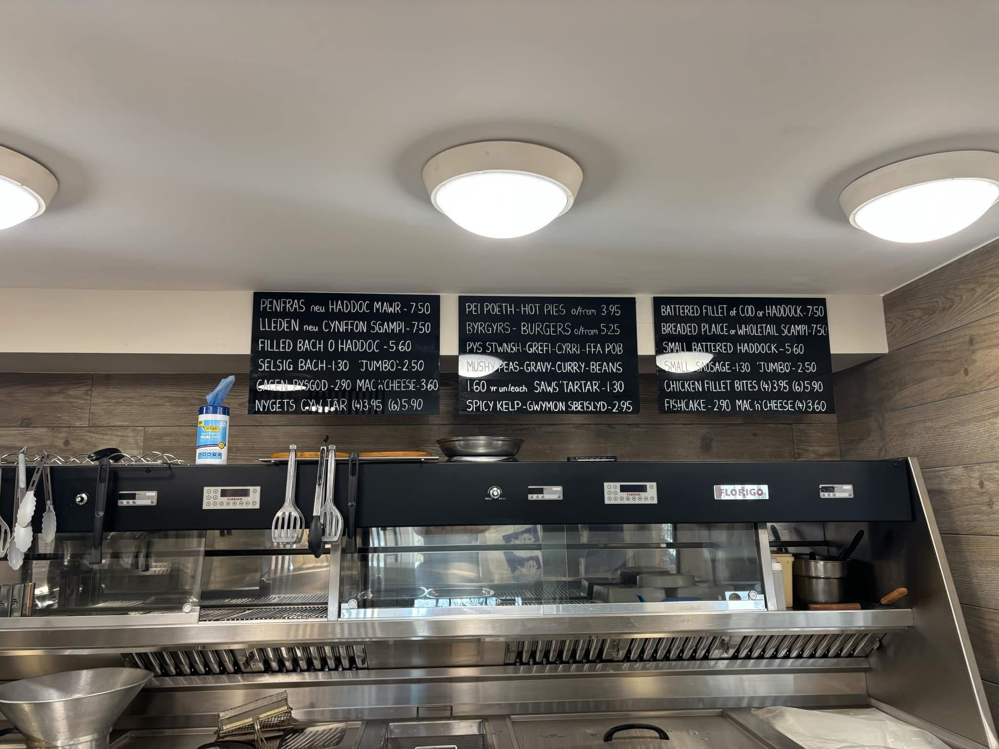 Yn ogystal â physgod a sglodion traddodiadol o ansawdd uchel sydd wedi’u coginio’n ffres (penfras, hadog, lledod) mae’r fwydlen yn cynnig amrywiaeth o brydau ac yn eu plith, teisennau cranc cartref a chynffonau cimychiaid a ddaliwyd yn lleol, wedi eu ffrio mewn cytew ysgafn creisionllyd, scampi, selsig, pastis a phasteiod, byrgyrs a chyw iâr ynghyd â detholiad o brydau ochr. Gellir gweini llawer o’r fwydlen yn rhydd o glwten ac mae wedi’i choginio mewn ffrïwr pwrpasol ar wahân. Mae’n syniad da archebu prydau GF ymlaen llaw. Mae’r staff cyfeillgar a gwybodus yn hapus i gynghori ar opsiynau GF ac ateb unrhyw gwestiynau ynghylch paratoi bwyd a chynhwysion. Gyda bwcio ymlaen llaw, gellir darparu ar gyfer grwpiau a phartïon hefyd.