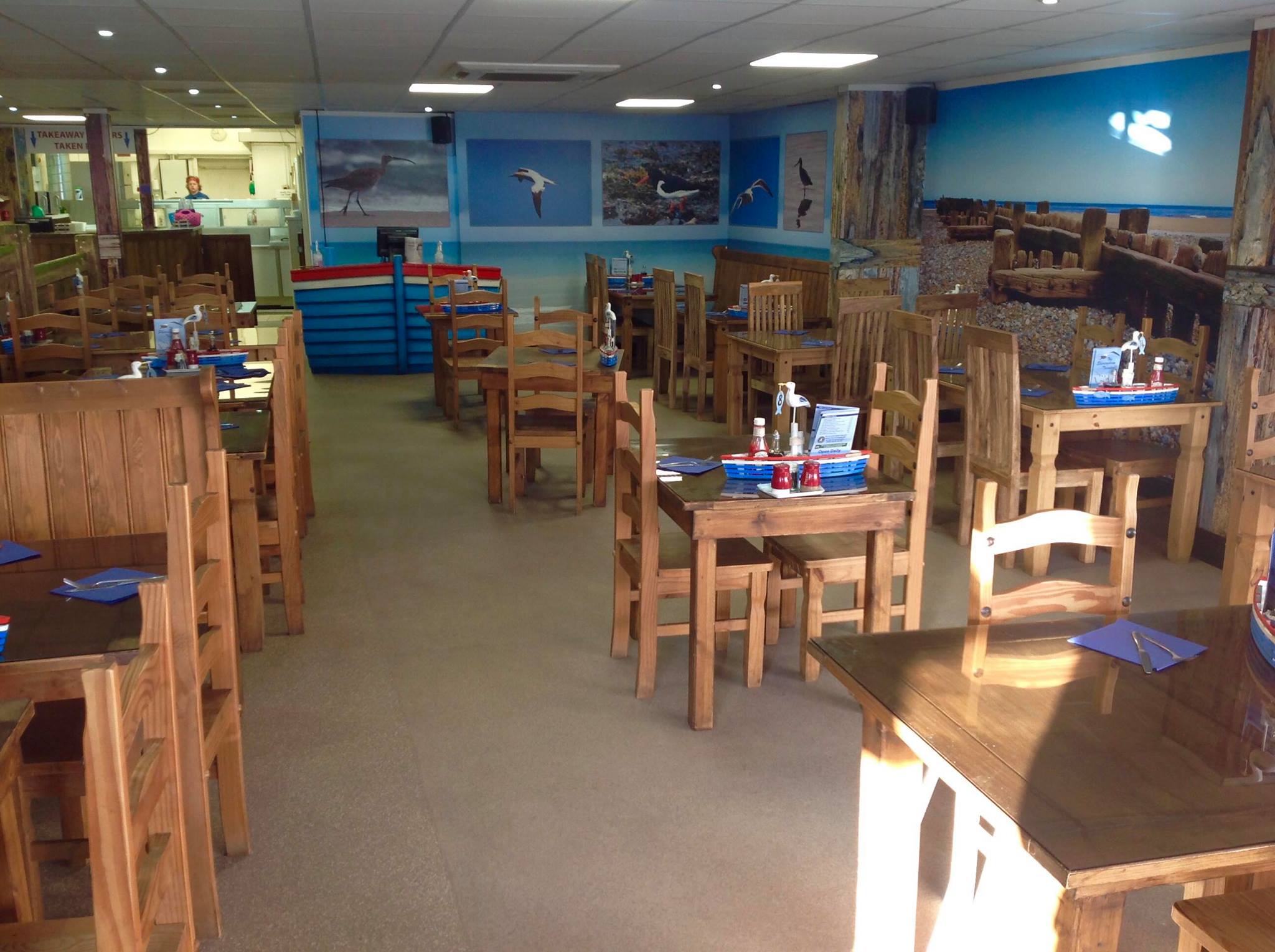 The Sheringham Trawler is a fish and chip restaurant and takeaway in the High Street, Sheringham offering affordable meals and a family-friendly approach with a fishing boat theme.